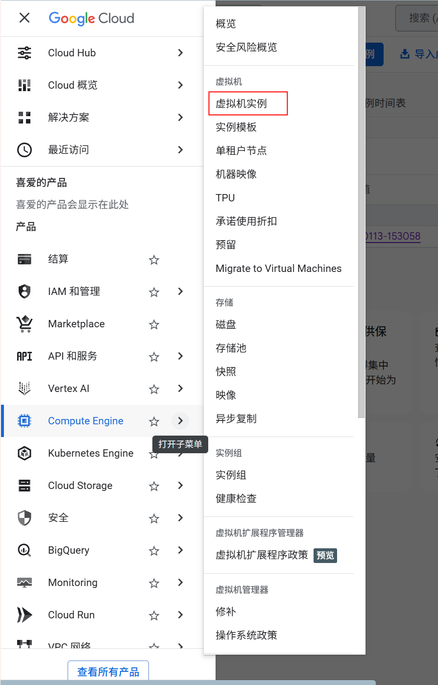选择左上角三条杠,然后鼠标移到 Compute Engine 这会再出现一个副表,再选择虚拟机实例。